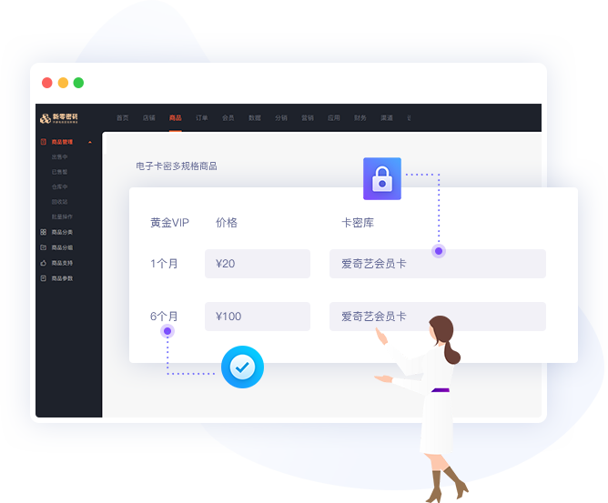 可设置不同的卡密分类,设置多规格卡密库,自定义名称,卡密库设置灵活多变,满足您的多样性需求。